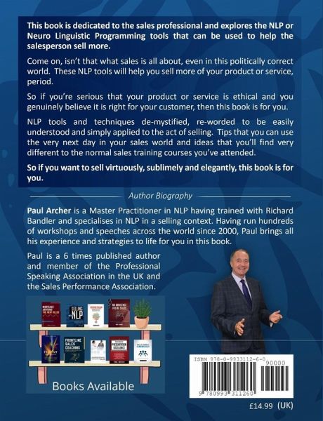 This book is dedicated to the sales professional and explores the NLP or Neuro Linguistic Programming tools that can be used to help the salesperson sell more. Come on, isn't that what sales is all about, even in this politically correct world. These NLP tools will help you sell more of your product or service, period. NLP tools and techniques de-mystified, re-worded to be easily understood and simply applied to the act of selling. Tips that you can use the very next day in your sales world and ideas that you'll find very different to the normal sales training courses you've attended. So if you want to sell virtuously, sublimely and elegantly, this book is for you.