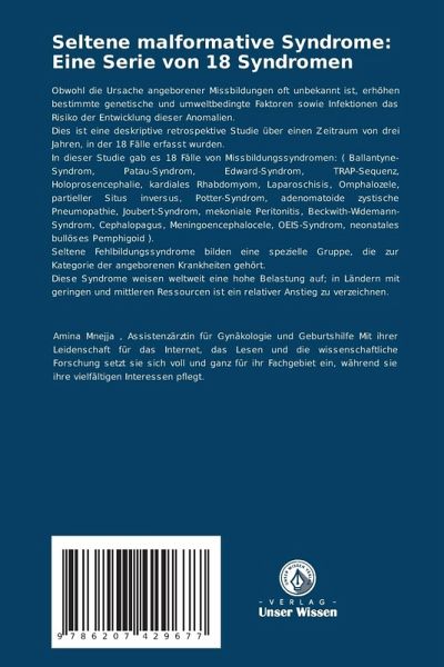 Obwohl die Ursache angeborener Missbildungen oft unbekannt ist, erhöhen bestimmte genetische und umweltbedingte Faktoren sowie Infektionen das Risiko der Entwicklung dieser Anomalien.Dies ist eine deskriptive retrospektive Studie über einen Zeitraum von drei Jahren, in der 18 Fälle erfasst wurden.In dieser Studie gab es 18 Fälle von Missbildungssyndromen: ( Ballantyne-Syndrom, Patau-Syndrom, Edward-Syndrom, TRAP-Sequenz, Holoprosencephalie, kardiales Rhabdomyom, Laparoschisis, Omphalozele, partieller Situs inversus, Potter-Syndrom, adenomatoide zystische Pneumopathie, Joubert-Syndrom, mekoniale Peritonitis, Beckwith-Widemann-Syndrom, Cephalopagus, Meningoencephalocele, OEIS-Syndrom, neonatales bullöses Pemphigoid ).Seltene Fehlbildungssyndrome bilden eine spezielle Gruppe, die zur Kategorie der angeborenen Krankheiten gehört.Diese Syndrome weisen weltweit eine hohe Belastung auf; in Ländern mit geringen und mittleren Ressourcen ist ein relativer Anstieg zu verzeichnen.