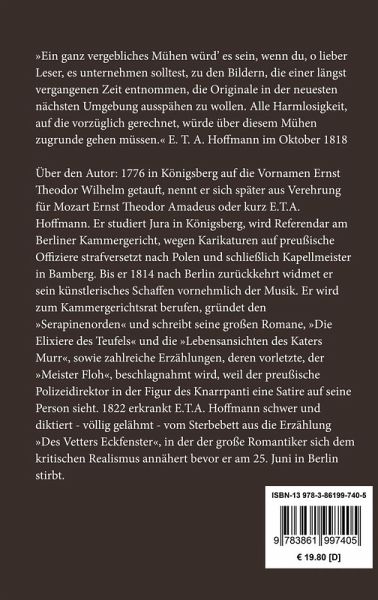 1776 in Königsberg auf die Vornamen Ernst Theodor Wilhelm getauft, nennt er sich später aus Verehrung für Mozart Ernst Theodor Amadeus oder kurz E.T.A. Hoffmann. Er studiert Jura in Königsberg, wird Referendar am Berliner Kammergericht, wegen Karikaturen auf preußische Offiziere strafversetzt nach Polen und schließlich Kapellmeister in Bamberg. Bis er 1814 nach Berlin zurückkehrt widmet er sein künstlerisches Schaffen vornehmlich der Musik. Er wird zum Kammergerichtsrat berufen, gründet den "Serapinenorden" und schreibt seine großen Romane, "Die Elixiere des Teufels" und die "Lebensansichten des Katers Murr", sowie zahlreiche Erzählungen, deren vorletzte, der "Meister Floh", beschlagnahmt wird, weil der preußische Polizeidirektor in der Figur des Knarrpanti eine Satire auf seine Person sieht. 1822 erkrankt E.T.A. Hoffmann schwer und diktiert - völlig gelähmt - vom Sterbebett aus die Erzählung "Des Vetters Eckfenster", in der der große Romantiker sich dem kritischen Realismus annähert bevor er am 25. Juni in Berlin stirbt.