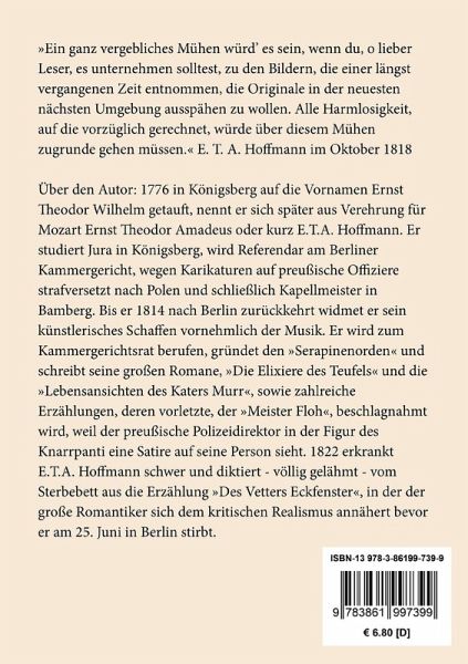 1776 in Königsberg auf die Vornamen Ernst Theodor Wilhelm getauft, nennt er sich später aus Verehrung für Mozart Ernst Theodor Amadeus oder kurz E.T.A. Hoffmann. Er studiert Jura in Königsberg, wird Referendar am Berliner Kammergericht, wegen Karikaturen auf preußische Offiziere strafversetzt nach Polen und schließlich Kapellmeister in Bamberg. Bis er 1814 nach Berlin zurückkehrt widmet er sein künstlerisches Schaffen vornehmlich der Musik. Er wird zum Kammergerichtsrat berufen, gründet den "Serapinenorden" und schreibt seine großen Romane, "Die Elixiere des Teufels" und die "Lebensansichten des Katers Murr", sowie zahlreiche Erzählungen, deren vorletzte, der "Meister Floh", beschlagnahmt wird, weil der preußische Polizeidirektor in der Figur des Knarrpanti eine Satire auf seine Person sieht. 1822 erkrankt E.T.A. Hoffmann schwer und diktiert - völlig gelähmt - vom Sterbebett aus die Erzählung "Des Vetters Eckfenster", in der der große Romantiker sich dem kritischen Realismus annähert bevor er am 25. Juni in Berlin stirbt.