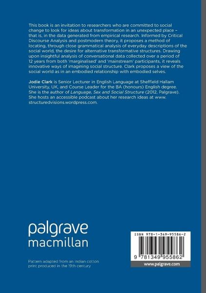 This book is an invitation to researchers who are committed to social change to look for ideas about transformation in an unexpected place - that is, in the data generated from empirical research. Informed by Critical Discourse Analysis and postmodern theory, it proposes a method of locating, through close grammatical analysis of everyday descriptions of the social world, the desire for alternative transformative structures. Drawing upon insightful analysis of conversational data collected over a period of 12 years from both 'marginalised' and 'mainstream' participants, it reveals innovative ways of imagining social structure. Clark proposes a view of the social world as in an embodied relationship with embodied selves.