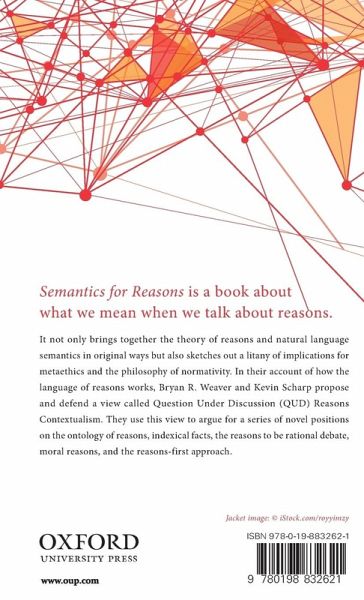 Semantics for Reasons is a book about what we mean when we talk about reasons. It not only brings together the theory of reasons and natural language semantics in original ways but also sketches out a litany of implications for metaethics and the philosophy of normativity. In their account of how the language of reasons works, Bryan R. Weaver and Kevin Scharp propose and defend a view called Question Under Discussion (QUD) Reasons Contextualism. They use this view to argue for a series of novel positions on the ontology of reasons, indexical facts, the reasons-to-be-rational debate, moral reasons, and the reasons-first approach.
