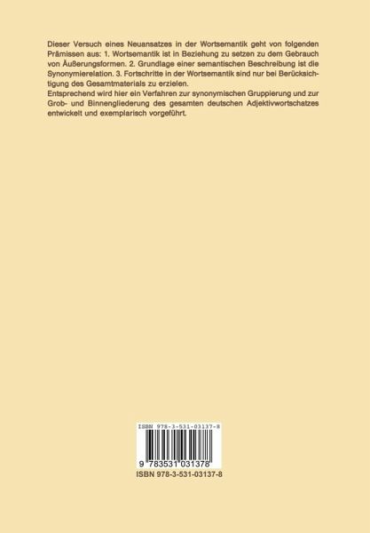 Das Forschungsprojekt "Semantik der Adjektive des Deutschen. Strukturelle Analyse der semantischen Relationen in den Wort feldern der deutschen Gegenwartssprache" wurde in den Jahren 1978 bis 1980 vom Minister fur Wissenschaft und Forschung des Landes Nordrhein-Westfalen mit Sach- und Personalmitteln ge fordert. Mit Materialerfassungs- und Sortierarbeiten waren im Rahmen des Forschungsvorhabens zeitweilig folgende Mit arbeiter beschaftigt: Alfred Haubner, Wolfgang Niehuser, wil helm Franke als Wissenschaftliche Hilfskrafte, Klaus Robering, Regina Frettloh, Monika Ausel, Arno Beyer, Volker Luckemeyer als Studentische Hilfskrafte. Wir sind ihnen allen zu Dank verpflichtet. INHALT A: Einlei tung 3 B: Zusammenhang von Gebrauchstheorie und semantischer Beschreibung . . 5 c: Grundlegung einer semantischen Beschreibung der Adjektive des Deutschen . . . . . . 16 I. Begrtindung der Materialauswahl . 16 II. Prinzipien der Materialerfassung . . . . 19 III. Verfahren und Ergebnisse einer Grobklassi- zierung . . . . . . . . . 24 D: Weitere Forschungsperspektiven . . 48 I. Aspekte einer Binnendifferenzierung . 48 II. Moglichkeiten einer Erfassung der Bedeutun- posi tionen . . . . . . . 58 E: EDV-Erfassung . . . . . 62 F: Literatur . . . . . . . . . . . 64 G: Anhang 1. Liste der Stimmungs-Adjektive mit Erl~uterung und Siglenverzeichnis . . . . . . . . . . . 72 2. Obersicht der erfaBten Synonymengruppen anhand der Orientierungslesarten . . . . . . 89 3. Ausgew~hlte Synonymengruppen im Bereich der Stimmungs-Adjektive . . . . . . . . 91 4. Das System der Bedeutungspositionen von seharf .