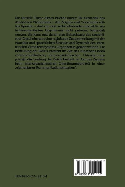 Die zentrale These dieses Buches lautet: Die Semantik des deiktischen Phänomens - des Zeigens und Verweisens mittels Sprache - darf von dem wahrnehmenden und aktiv verhaltensorientierten Organismus nicht getrennt behandelt werden. Sie kann erst durch eine Betrachtung des sprachlichen Geschehens in einem globalen Zusammenhang mit der visuellen und sprachlichen Struktur und Dynamik des intentionalen Verhaltenssystems Organismus geklärt werde. Die Bedeutung der Deixis entsteht im Akt des Hinsehens beim vorkommunikativen, intra-organismischen Orientierungsprozeß, die Leistung der Deixis besteht im Akt des Zeigens beim inter-organismischen Orientierungsprozeß in einer "elementaren Kommunikationssituation".