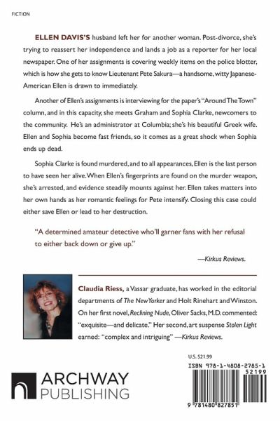 Ellen Davis's husband left her for another woman. Post-divorce, she's trying to reassert her independence and lands a job as a reporter for her local newspaper. One of her assignments is covering weekly items on the police blotter, which is how she gets to know Lieutenant Pete Sakura-a handsome, witty Japanese- American Ellen is drawn to immediately. Another of Ellen's assignments is interviewing for the paper's "Around The Town" column, and in this capacity, she meets Graham and Sophia Clarke, newcomers to the community. He's an administrator at Columbia; she's his beautiful Greek wife. Ellen and Sophia become fast friends, so it comes as a great shock when Sophia ends up dead. Sophia Clarke is found murdered, and to all appearances, Ellen is the last person to have seen her alive. When Ellen's fingerprints are found on the murder weapon, she's arrested, and evidence steadily mounts against her. Ellen takes matters into her own hands as her romantic feelings for Pete intensify. Closing this case could either save Ellen or lead to her destruction. "A determined amateur detective who'll garner fans with her refusal to either back down or give up." -Kirkus Reviews.