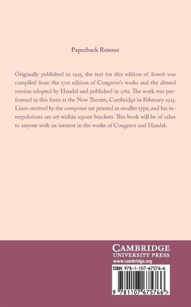Originally published in 1925, the text for this edition of Semele was compiled from the 1710 edition of Congreve's works and the altered version adopted by Handel and published in 1762. The work was performed in this form at the New Theatre, Cambridge in February 1925. Lines omitted by the composer are printed in smaller type, and his interpolations are set within square brackets. This book will be of value to anyone with an interest in the works of Congreve and Handel.