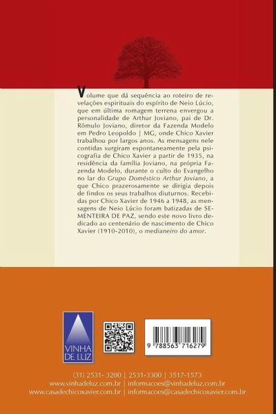 Sementeira de paz Neio Lúcio (espírito) Francisco Cândido Xavier (autor) Wanda Amorim Joviano (organizadora) Volume que dá sequência ao roteiro de revelações espirituais do espírito de Neio Lúcio, que em última romagem terrena envergou a personalidade de Arthur Joviano, pai de Dr. Rômulo Joviano, diretor da Fazenda Modelo em Pedro Leopoldo MG, onde Chico Xavier trabalhou por largos anos. As mensagens nele contidas surgiram espontaneamente pela psicografia de Chico Xavier a partir de 1935, na residência da família Joviano, na própria Fazenda Modelo, durante o culto do Evangelho no lar do Grupo…mehr