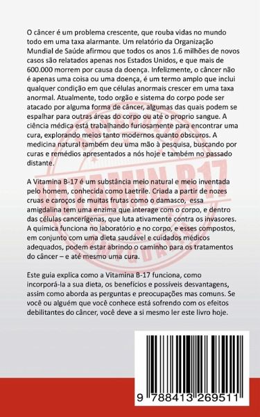 O câncer é um problema crescente, que rouba vidas no mundo todo em uma taxa alarmante. Um relatório da Organização Mundial de Saúde afirmou que todos os anos 1.6 milhões de novos casos são relatados apenas nos Estados Unidos, e que mais de 600.000 morrem por causa da doença. Infelizmente, o câncer não é apenas uma coisa ou uma doença, é um termo amplo que inclui qualquer condição em que células anormais crescer em uma taxa anormal. Atualmente, todo orgão e sistema do corpo pode ser atacado por alguma forma de câncer, algumas das quais podem se espalhar para outras áreas do corpo ou até o proprio sangue. A ciência médica está trabalhando furiosamente para encontrar uma cura, explorando meios tanto modernos quanto obscuros. A medicina natural também deu uma mão à pesquisa, buscando por curas e remédios apresentados a nós hoje e também no passado distante. A Vitamina B-17 é um substância meio natural e meio inventada pelo homem, conhecida como Laetrile. Criada a partir de nozes cruas e caroços de muitas frutas como o damasco, essa amigdalina tem uma enzima que interage com o corpo, e dentro das células cancerígenas, que luta ativamente contra os invasores. A química funciona no laboratório e no corpo, e esses compostos, em conjunto com uma dieta saudável e cuidados médicos adequados, podem estar abrindo o caminho para os tratamentos do câncer - e até mesmo uma cura. Este guia explica como a Vitamina B-17 funciona, como incorporá-la a sua dieta, os benefícios e possíveis desvantagens, assim como aborda as perguntas e preocupações mas comuns. Se você ou alguém que você conhece está sofrendo com os efeitos debilitantes do câncer, você deve a si mesmo ler este livro hoje.