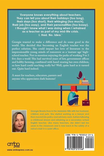 'Everyone knows everything about teachers. They can tell you about their holidays (too long), their days (too short), their whingeing (too much), their job (too easy), and their personalities (too bossy). I thought I knew what I was doing when I retrained as a teacher as part of my mid-life crisis. I. Had. No. Idea.' Georgie wanted to make a difference and do some good in the world. She decided that becoming an English teacher was the perfect solution. She could impart her love of literature to the impressionable young minds of tomorrow as a 'mature-age' high-school teacher. Not to mention enjoying the perks of working 9 to 3 five days a week! She had survived years of law, government offices and hobby farming, combined with hand-rearing her own children, so how hard could teaching really be? Well, quite hard as it turned out. Quite hard indeed. A must for teachers, educators, parents and anyone who appreciates dark humour!