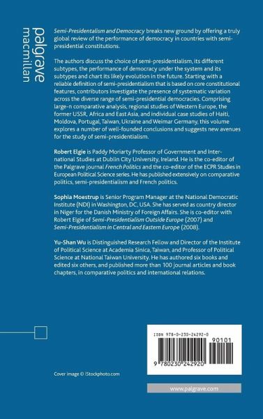 Semi-Presidentialism and Democracy; R.Elgie , S.Moestrup & Y-S.Wu PART I: VARIETIES OF SEMI-PRESIDENTIALISM Semi-Presidentialism and Democracy: Institutional Choice, Performance and Evolution; R.Elgie The Study of Semi-Presidentialism: An Holistic Approach; Y-S.Wu PART II: THE PERFORMANCE OF SEMI-PRESIDENTIALISM: GENERAL AND REGIONAL PERSPECTIVES Overview of the Performance of Semi-Presidentialism; S.Moestrup Parliamentary Cohesion and Government Formation in Semi-Presidential Democracies; J-W.Lin Semi-Presidentialism in Western Europe; R.Elgie Semi-Presidentialism under Post-Communism; O.Protsyk Semi-Presidentialism and Democratic Development in East Asia; B.Reilly Semi-Presidentialism in Africa; Patterns and Trends; S.Moestrup PART III: THE PERFORMANCE OF SEMI-PRESIDENTIALISM: COUNTRY PERSPECTIVES The President as a Backseat Driver: Portugal's Evolving Semi-Presidentialism; C.Jalali Taiwan: Democratic Consolidation under Presidential Supremacy; Y-S.Wu & J-H.Tsai Semi-Presidentialism and Parliamentary Oligarchy in Post-Orange Ukraine; K.Matsuzato Moldova's Transition from Semi-Presidentialism: Parliamentary Intentions, Presidential Outcome; W.Crowther Semi-Presidentialism in the Weimar Republic: A Failed Attempt at Democracy; Y-C.Shen Semi-Presidentialism and Democracy: What Have we Learnt?; R.Elgie