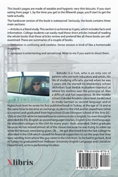 This book's pages are made of eatable and hygienic very thin biscuits. If you start eating from page 1, by the time you get to the fifteenth page, you'll start to get the taste actually. The hardcover version of the book is waterproof. Seriously, the book contains three main sections: -Articles is a literal study. This section is as formal as it gets, which includes facts and information. College students can easily read these short articles instead of reading the whole books that these articles review and pretend like all these books are self-examined. These are summaries of a couple of books. -Sensation is confusing and careless. Sense session is kind of like a session of senses. It is a homemade magazine. -Synopses is entertaining and sensational. Write to me if you want to shoot them.