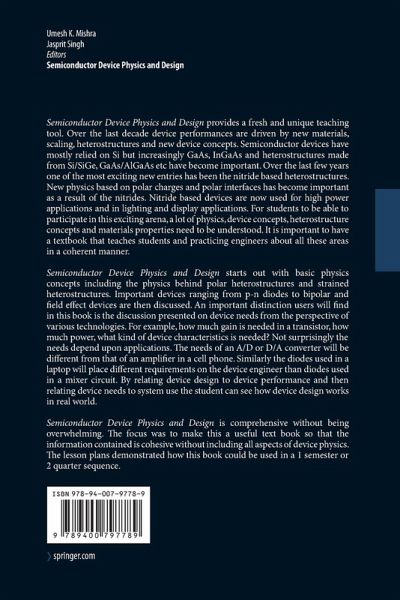 emiconductor Device Physics and Design starts out with basic physics concepts including the physics behind polar heterostructures and strained heterostructures. Important devices ranging from p-n diodes to bipolar and field effect devices is then discussed. An important distinction users will find in this book is the discussion presented on device needs from the perspective of various technologies. For example, how much gain is needed in a transistor, how much power, what kind of device characteristics are needed. Not surprisingly the needs depend upon applications. The needs of an A/D or D/A converter will be different from that of an amplifier in a cell phone. Similarly the diodes used in a laptop will place different requirements on the device engineer than diodes used in a mixer circuit. By relating device design to device performance and then relating device needs to system use the student can see how device design works in real world.