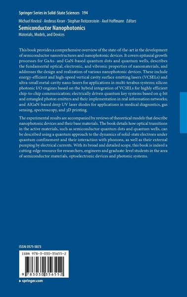 This book provides a comprehensive overview of the state-of-the-art in the development of semiconductor nanostructures and nanophotonic devices. It covers epitaxial growth processes for GaAs- and GaN-based quantum dots and quantum wells, describes the fundamental optical, electronic, and vibronic properties of nanomaterials, and addresses the design and realization of various nanophotonic devices. These include energy-efficient and high-speed vertical cavity surface emitting lasers (VCSELs) and ultra-small metal-cavity nano-lasers for applications in multi-terabus systems; silicon photonic I/O engines based on the hybrid integration of VCSELs for highly efficient chip-to-chip communication; electrically driven quantum key systems based on q-bit and entangled photon emitters and their implementation in real information networks; and AlGaN-based deep UV laser diodes for applications in medical diagnostics, gas sensing, spectroscopy, and 3D printing.