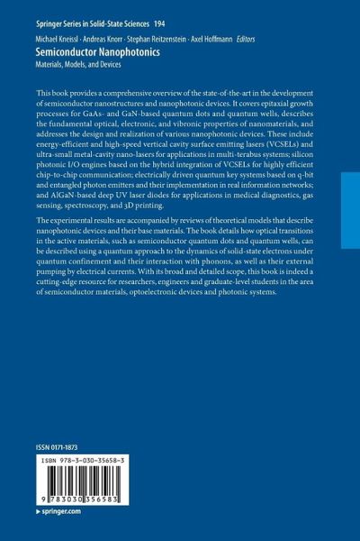 This book provides a comprehensive overview of the state-of-the-art in the development of semiconductor nanostructures and nanophotonic devices. It covers epitaxial growth processes for GaAs- and GaN-based quantum dots and quantum wells, describes the fundamental optical, electronic, and vibronic properties of nanomaterials, and addresses the design and realization of various nanophotonic devices. These include energy-efficient and high-speed vertical cavity surface emitting lasers (VCSELs) and ultra-small metal-cavity nano-lasers for applications in multi-terabus systems; silicon photonic I/O engines based on the hybrid integration of VCSELs for highly efficient chip-to-chip communication; electrically driven quantum key systems based on q-bit and entangled photon emitters and their implementation in real information networks; and AlGaN-based deep UV laser diodes for applications in medical diagnostics, gas sensing, spectroscopy, and 3D printing.