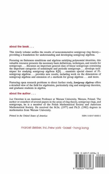 Gathers and unifies the results of the theory of noncommutative semigroup rings, primarily drawing on the literature of the last 10 years, and including several new results. Okninski (Warsaw U., Poland) restricts coverage to the ring theoretical properties for which a systematic treatment is current