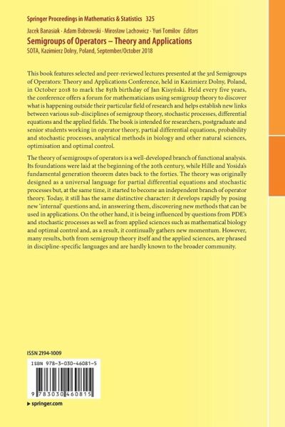 This book features selected and peer-reviewed lectures presented at the 3rd Semigroups of Operators: Theory and Applications Conference, held in Kazimierz Dolny, Poland, in October 2018 to mark the 85th birthday of Jan Kisynski. Held every five years, the conference offers a forum for mathematicians using semigroup theory to discover what is happening outside their particular field of research and helps establish new links between various sub-disciplines of semigroup theory, stochastic processes, differential equations and the applied fields. The book is intended for researchers, postgraduate and senior students working in operator theory, partial differential equations, probability and stochastic processes, analytical methods in biology and other natural sciences, optimisation and optimal control.