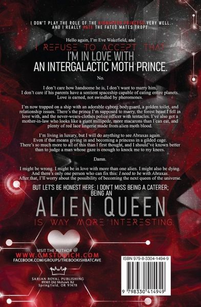 I don't play the role of the kidnapped princess very well.And I really hate the fated mates trope.Hello again, I'm Eve Wakefield, and I refuse to accept that I'm in love with an intergalactic moth prince.No.I don't care how handsome he is, I don't want to marry him.I don't care if his parents have a sentient spaceship capable of eating entire planets.Love is earned, not swindled by pheromones.I'm now trapped on a ship with an adorable cyborg bodyguard, a golden toilet, and relationship issues. There's the prince I'm supposed to marry, the forest beast I fell in love with, and the never-wears-clothes police officer with tentacles. I've also got a mother-in-law who looks like a giant millipede, more macarons than I can eat, and plenty of red lace lingerie made from alien moth blood.I'm living in luxury, but I will do anything to see Abraxas again.Even if that means giving in and becoming a princess in a gilded cage.There's so much more to all of this than I first thought, and I should've known better than to judge a man whose gaze is enough to knock me to my knees.Damn.I might be wrong. I might be in love with more than one alien. I might also be dying. And there's only one person who can fix this: I need to be with Abraxas.After that, I'll worry about the possibility of becoming the next queen of the universe.But let's be honest here: I don't miss being a caterer; being an alien queen is way more interesting.