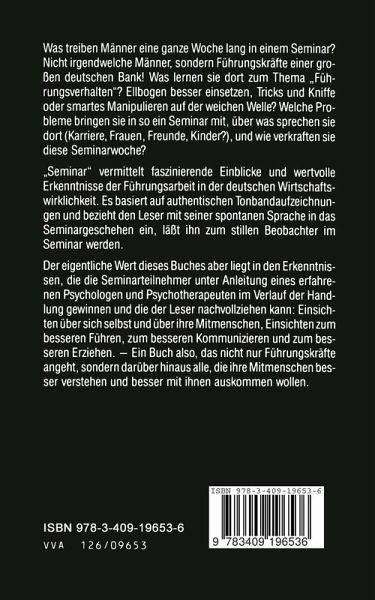 Über das Buch.- Montag abend.- Begrüßung der Teilnehmer.- Seminarerwartungen der Teilnehmer.- Sechs Besonderheiten des Seminars.- Dienstag vormittag.- Roter Faden (1).- Besprechung der ersten Eindrücke der Teilnehmer vom Seminarleiter.- Nonverbale Kommunikation.- Vorbemerkung zu den Feedbacks.- Das "SIDA-Schema".- Roter Faden (2).- Vorbereitung auf die Feedbacks.- Feedback-Regeln.- 1. Feedback (für Carl).- Dienstag nachmittag.- 2. Feedback (für Martin).- 3. Feedback (für Winfried).- Kommunikationsstörungen im Bereich der Sach-Aussage: "Verständlichkeit" und "Stimulanz".- Kommunikationsstörungen im Bereich der Ich-Aussage: "Offenheit".- 4. Feedback (für Wolfhard).- Der "Dornröschen-Effekt".- Dienstag abend.- 5. Feedback (für Mischa).- 6. Feedback (für Heinz).- Mittwoch vormittag.- Roter Faden (3).- Kommunikationsstörungen im Bereich der Du-Aussage: "Wertschätzung".- "Wertschätzung" und "Lenkung" in der Kindererziehung.- Kommunikationsstörungen im Bereich der Aufforderung: "Direktheit".- Vier Hauptgebote guter Kommunikation.- Mittwoch nachmittag.- Deformationsmechanismen menschlicher Wahrnehmung.- Zum "Klecksbild".- Auswirkungen von Bezugssystemen.- Auswirkungen von Bezugssystemen im SIDA-Modell der Kommunikation.- Aggressionen als Liebeserklärungen.- Weitere Experimente zum Thema "Bezugssysteme".- Roter Faden (4).- Zwei Merksätze zum SIDA-Modell der Kommunikation.- 7. Feedback (für Ernst).- Ein ausführliches Fallbeispiel zur Anwendung des SIDA-Modells der Kommunikation.- Weitreichende Konsequenzen aus dem Fallbeispiel.- Mittwoch abend.- 8. Feedback (für Friedhelm).- 9. Feedback (für Albert).- Donnerstag vormittag.- Entstehung von Ko-Störungen im SIDA-Modell.- Formen defensiven und aggressivenKo-Verhaltens.- Verhaltensweisen, die zur Vermeidung oder Beseitigung von Ko-Störungen geeignet sind.- Roter Faden (5).- Die "10 Wertschätzungsgebote".- Vorbereitung auf die Rollenspiele.- Donnerstag nachmittag.- Erstes Rollenspiel.- Lernpunkte aus dem ersten Rollenspiel.- Zweites Rollenspiel.- Donnerstag abend.- Lernpunkte aus dem zweiten Rollenspiel.- Wurden die Teilnehmer manipuliert?.- Freitag vormittag.- Drittes Rollenspiel.- Auswertung und Lernpunkte des dritten Rollenspiels.- Abschlußphase des Seminars.- Anmerkungen.