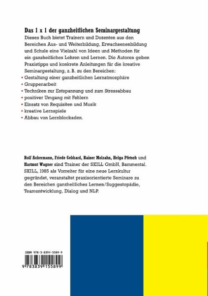 Dieses Buch bietet Trainern und Dozenten aus den Bereichen Aus- und Weiterbildung, Erwachsenenbildung und Schule eine Vielzahl von Ideen und Methoden für ein ganzheitliches Lehren und Lernen. Die Autoren geben Praxistipps und konkrete Anleitungen für die kreative Seminargestaltung, z. B. zu den Bereichen: -Gestaltung einer ganzheitlichen Lernatmosphäre-Gruppenarbeit-Techniken zur Entspannung und zum Stressabbau-Positiver Umgang mit Fehlern-Eindatz von Requisiten und Musik-Kreative Lernspiele Abbau von LernblockadenRolf Ackermann, Friede Gebhard, Rainer Molzahn, Helga Pfetsch und Hartmut Wagner sind Trainer der SKILL GmbH, Bammental. SKILL, 1985 als Vorreiter für eine neue Lernkultur gegründet, veranstaltet praxisorientierte Seminare zu den Bereichen ganzheitliches Lernen/Suggestopädie, Teamentwicklung, Dialog und NLP.