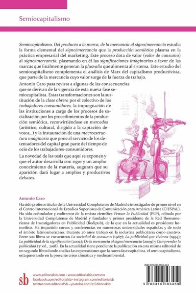 Semiocapitalismo. Del producto a la marca, de la mercancía al signo/mercancía estudia la forma elemental del signo/mercancía que la producción semiótica plasma en la práctica empresarial del marketing. Este proceso dota de valor (valor de consumo) al signo/mercancía, plasmando en él las significaciones imaginarias a favor de las marcas que finalmente generan la plusvalía que alimenta al sistema. Este estudio del semiocapitalismo complementa el análisis de Marx del capitalismo productivista, que parte de la mercancía cuyo valor surge de la fuerza de trabajo. Antonio Caro pasa revista a algunas de las consecuencias que se derivan de la vigencia de esta nueva fase semiocapitalista. Estas transformaciones son la sustitución de la clase obrera por el colectivo de los trabajadores-consumidores, la impregnación de las instituciones a cargo de los procesos de socialización por los procedimientos de la producción semiótica, reconvirtiéndose en mercados (artístico, cultural, dirigido a la captación de votos...) y la instauración de una macroestructura imaginaria que pone al servicio de los detentadores del capital gran parte del tiempo de ocio de los trabajadores-consumidores. >Antonio Caro Almela ha sido profesor titular de la Universidad Complutense de Madrid e investigador de primer nivel en el Centro Internacional de Estudios Superiores de Comunicación para América Latina (CIESPAL). Ha sido cofundador y codirector de la revista científica Pensar la Publicidad (PLP), editada por la Universidad Complutense de Madrid y fundador y primer presidente de la Red Iberoamericana de Investigadores en Publicidad (Redipub), de la que en la actualidad es presidente honorífico. Ha impartido cursos y conferencias en numerosas universidades españolas y de todo el ámbito latinoamericano. Durante 26 años trabajó en la industria publicitaria como creativo. Entre sus libros se encuentran La sociedad de consumo (1967); La publicidad que vivimos (1994); La publicidad de la significación (2002); De la mercancía al signo/mercancía (2009) y Comprender la publicidad (3a ed., 2018). >