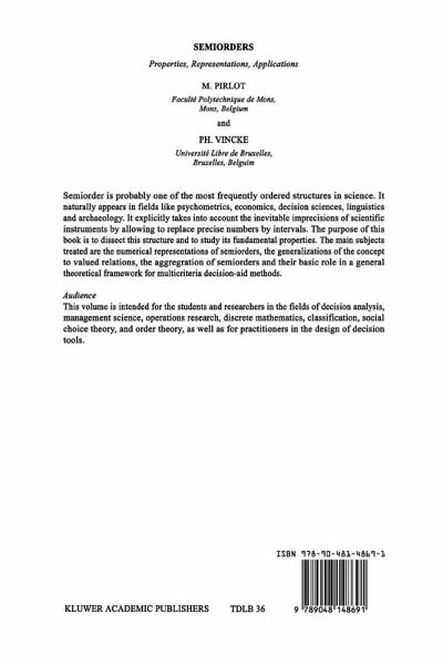 Semiorder is probably one of the most frequently ordered structures in science. It naturally appears in fields like psychometrics, economics, decision sciences, linguistics and archaeology. It explicitly takes into account the inevitable imprecisions of scientific instruments by allowing the replacement of precise numbers by intervals. The purpose of this book is to dissect this structure and to study its fundamental properties. The main subjects treated are the numerical representations of semiorders, the generalizations of the concept to valued relations, the aggregation of semiorders and their basic role in a general theoretical framework for multicriteria decision-aid methods.