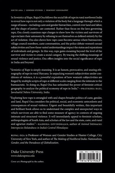 In Semiotics of Rape, Rupal Oza follows the social life of rape in rural northwest India to reveal how rape is not only a violation of the body but a language through which a range of issues-including caste and gender hierarchies, control over land and labor, and the shape of justice-are contested. Rather than focus on the laws governing rape, Oza closely examines rape charges to show how the victims and survivors of rape reclaim their autonomy by refusing to see themselves as defined entirely by the act of violation. Oza also shows how rape cases become arenas where bureaucrats, village council members, caste communities, and the police debate women's sexual subjectivities and how those varied understandings impact the status and reputations of individuals and groups. In this way, rape gains meaning beyond the level of the survivor and victim to create a social category. By tracing the shifting meanings of sexual violence and justice, Oza offers insights into the social significance of rape in India and beyond.