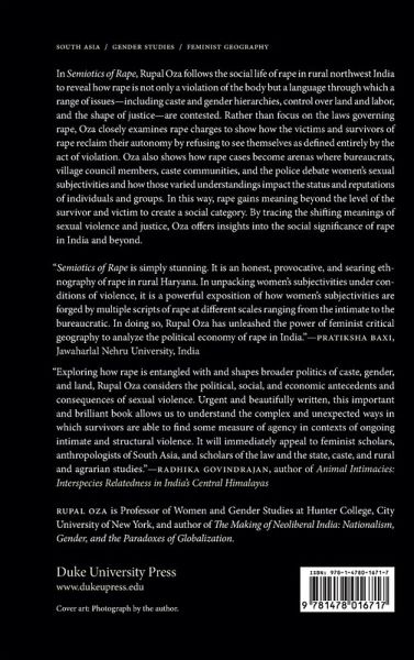 In Semiotics of Rape, Rupal Oza follows the social life of rape in rural northwest India to reveal how rape is not only a violation of the body but a language through which a range of issues-including caste and gender hierarchies, control over land and labor, and the shape of justice-are contested. Rather than focus on the laws governing rape, Oza closely examines rape charges to show how the victims and survivors of rape reclaim their autonomy by refusing to see themselves as defined entirely by the act of violation. Oza also shows how rape cases become arenas where bureaucrats, village council members, caste communities, and the police debate women's sexual subjectivities and how those varied understandings impact the status and reputations of individuals and groups. In this way, rape gains meaning beyond the level of the survivor and victim to create a social category. By tracing the shifting meanings of sexual violence and justice, Oza offers insights into the social significance of rape in India and beyond.