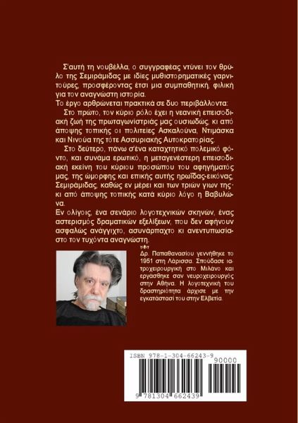 S'afti ti nouvella, o syngrafeas dynei ton thrylo tis Semiramidas me idíes mythistorimatikes garnitoures, prosferontas etsi mia sympathitiki, filiki gia ton anagnosti istoria. To ergo arthronetai praktika se dyo perivallonta: Sto proto, ton kyrio rolo exei i neaniki epeisodiaki zoi tis protagonistrias mas ousiodos, ki apo apopsis topikis oi politeies Askalouna, Dimaska kai Ninoua tis tote Assyriakis Aftokratorias. Sto deftero, pano s'ena kataxtitiko polemiko fonto, kai synama erotiko, i metagenesteri epeisodiaki ekeini tou kyriou prosopou tou afigimatos mas, tis omorfis kai epikis aftis iroidas-eikonas, Semiramidas, kathos en merei kai ton trion gion tis¿ ki apo apopsis topikis kata kyrio logo i Babylona. En oligois, ena senario logotexnikon skinon, enas asterismos dramatikon ekselikseon, pou den afinoun asfalos anangixto, asynarpaxto ki anentyposiasto ton tyxonta anagnosti.