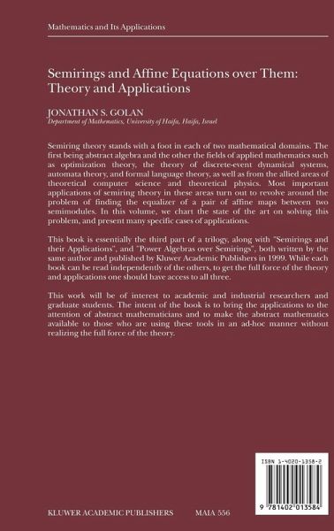From the reviews: "The author points out that many important applications of semiring theory can be reduced to the problem of finding solutions of affine equations ... . theory with complete proofs as well as illustrating examples can be found. A carefully written index of applications and an index of terminology help the reader to find the numerous concepts mentioned throughout the book. Also an extensive bibliography (490 titles) is included to show the wide range of applications of the developed concepts in many areas ... ." (Udo Hebisch, Zentralblatt MATH, Vol. 1042, 2004)