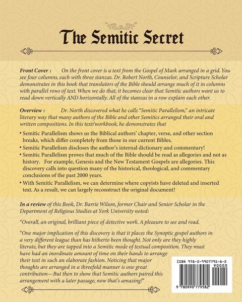 On the front cover is a text from the Gospel of Mark arranged in a grid. You see four columns, each with three stanzas. Dr. Robert North, Counselor, and Scripture Scholar demonstrate in this book that translators of the Bible should arrange much of it in columns with parallel rows of text. When we do that, it becomes clear that Semitic authors want us to read down vertically AND horizontally. Dr. North calls this methodology, "Semitic Parallelism." In this workbook, he shows that ¿Semitic Parallelism delineates the Biblical authors' chapter, verse, and other section breaks, which differ completely from those in our current Bibles. ¿Semitic Parallelism discloses the author's internal dictionary and commentary! ¿Semitic Parallelism proves that much of the Bible should be read as allegories and not as history. This discovery calls into question most of the historical, theological, and commentary conclusions of the past 2000 years. ¿ With Semitic Parallelism, we can determine where copyists have deleted and inserted text. As a result, we can largely reconstruct the original document! Again, this is a workbook. The reader will be given opportunities to use principles to arrange for himself the Garden of Eden story, the Covenant, and sections from Matthew, Mark, Luke, John, and the Gospel of Thomas. With that knowledge, he will be able to organize other parts of the Bible as never before seen. In a review of this Book, Dr. Barrie Wilson, former Chair and Senior Scholar in the Department of Religious Studies at York University noted: "Overall, an original, brilliant piece of detective work. A pleasure to see and read. One major implication of this discovery is that it shows that the Synoptic gospel authors not only were highly literate, but they were tapped into a Semitic mode of textual composition. They must have had an inordinate amount of time on their hands to arrange their text in such an elaborate fashion. Noticing that major thoughts are arranged in a threefold manner is one great contribution by Dr. North--but then to show that Old Testament and Semitic authors paired this arrangement with a later passage, now that's amazing!"