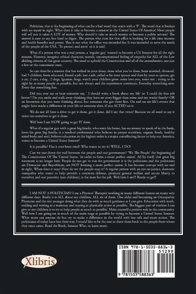 " Politician, that is the beginning of what can be a bad word that starts with a 'P'. The word that is broken with no repair in sight. What does it take to become a senator in the United States Of America? Most people will tell you it takes A LOT of money. Why should it take so much money to become a public servant? The answer is easy to say, but hard to digest. The person who runs for that office is looking for a life time income and health benefits and power. That is not what the office was intended for. It was intended to serve the needs of the people of the USA. 'To protect and serve' so it is said. What if a person who was a real person, a 'regular guy' wanted to become a US Senator for all the right reasons. Honesty, integrity, ethical character, morals, uncompromised feeling of empathy for ALL of the Law abiding citizens of this great country. The need to uphold the Constitution and all of the amendments, not just a few or the convenient ones. So can there be a senator that has walked in your shoes, done what you've done, been married, divorced, had 5 children, been educated, found a job, lost a job, yelled at by your spouse and then by your ex spouse, get a cat, 2 cats, a dog , 2 dogs, Iguanas, frogs, watch your children grow, some love you, some not , trying to do right by as many people as possible, but not always and the experiences continues. Everyday something new. Every day something fun. Did you ever say or hear someone say, ' I should write a book about my life' or 'I could do that job better'? Do you smile and walk away thinking they have no story bigger than mine and my wacky family? OR an Invention that you were thinking about, but someone else got there first. On and on are life's events that might have made a difference in your life or someone elses, if you ACTED on it. We do not all have a drive to get it done, get it done, did I say that twice? Because we all need to say it twice too ourselves to get it done. Well here I am NOW going to get IT done. What if a regular guy with a great big family, who rents his home, has no money to speak of in the bank, loves his great big family, is a medical professional who believes in proper nutrition, organic foods, healthy mind body and soul, believes education in the highest order is a major contributing factor to help out America, wants to become a United States Senator? Is it possible? Has it ever been tried? Who wants to try it? WELL, I DO! Can we tear down the wall between the people and our government? 'We The People' the beginning of The Constitution Of The United States, 'in order to form a more perfect union'. All by itself, that great big statement is no longer here. People do not get to run the government it is the politicians and the politicians are Democrat and Republican, are NOT forming a more perfect union. It has become corrupt with no end in sight. When does it stop? How do we the people stop it? A regular person with an eye on justice, domestic tranquility who wants to help provide a common defense, promote general welfare and secure liberty to ourselves and our posterity (our children), is the man for the job. Well here I am!!! Ready to go!!!"