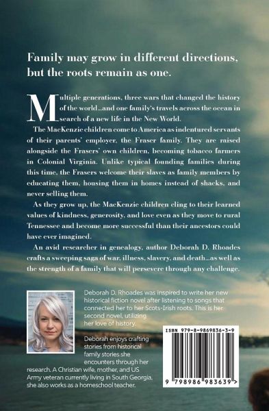 Multiple generations, three wars that changed the history of the world...and one family's travels across the ocean in search of a new life in the New World. The MacKenzie children come to America as indentured servants of their parents' employer, the Fraser family. They are raised alongside the Frasers' own children, becoming tobacco farmers in Colonial Virginia. Unlike typical founding families during this time, the Frasers welcome their slaves as family members by educating them, housing them in homes instead of shacks, and never selling them. As they grow up, the MacKenzie children cling to their learned values of kindness, generosity, and love even as they move to rural Tennessee and become more successful than their ancestors could have ever imagined.
