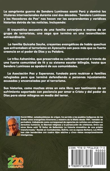 La violencia que sufre la gente inocente en lugares como Ucrania, Sudán, Congo y el Medio Oriente nos rompe el corazón. Hace años, personas inocentes en Perú sufrieron una tragedia similar y vivieron para ver un día mejor. La suya es una historia de cómo el bien venció al mal. La sangrienta guerra de Sendero Luminoso azotaba Perú y dominó los titulares internacionales durante casi dos décadas. El Sendero y los Hacedores de Paz nos hacen ver las sorprendentes y verídicas historias detrás de las noticias - El traumático secuestro de una familia extranjera a manos de Sendero Luminoso, una saga que termina en una eventual reconciliación extraordinaria. - La familia Quicaña Sauñe, creyentes evangélicos de habla quechua que enfrentaban el terrorismo en Ayacucho con poco más que su fuerte creencia en el poder de Dios y su Palabra. - Los integrantes de la tribu Ashaninka, que preservaban su cultura ancestral a través de una fuerte comunidad de fe y su sistema escolar bilingüe, hasta que Sendero Luminoso se apoderó de sus comunidades. - La Asociación Paz y Esperanza, fundada para reubicar a familias refugiadas pero que terminó obligada a defender a personas encarceladas y acusadas injustamente de terrorismo. Sus historias, como muchas otras que aparecen en este libro, son testimonio de un sufrimiento soportado con paciencia, por amor a Cristo; además, apoyado en el poder de Dios para obrar milagros en medio del terror.