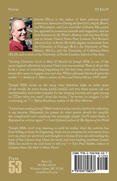 "Sending Christmas Cards to Huck & Hamlet by Joseph Mills is one of the most original collections of poetry I have ever encountered-original because it treats the whole world of books, poems, stories, fairy tales not only as being somehow more real than reality itself but as our most important lifelines to reality itself. There is about this book a sense of everything happening for the first time, even those literary events that seem to happen over and over. What a pleasure this book gives the reader." - Anthony Abbot, author of New and Selected Poems: 1989-2009