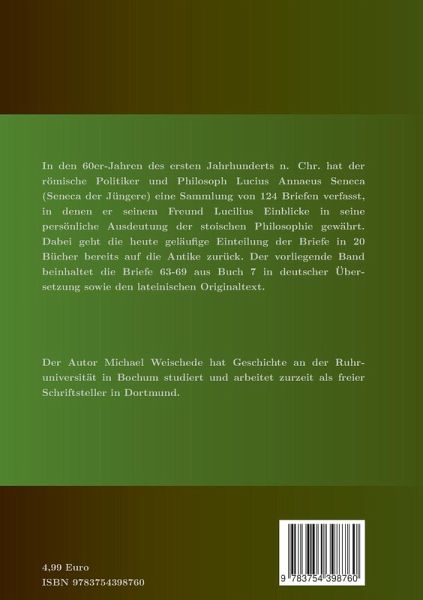 In den 60er-Jahren des ersten Jahrhunderts n. Chr. hat der römische Politiker und Philosoph Lucius Annaeus Seneca (Seneca der Jüngere) eine Sammlung von 124 Briefen verfasst, in denen er seinem Freund Lucilius Einblicke in seine persönliche Ausdeutung der stoischen Philosophie gewährt. Dabei geht die heute geläufige Einteilung der Briefe in 20 Bücher bereits auf die Antike zurück. Der vorliegende Band beinhaltet die Briefe 63-69 aus Buch 7 in deutscher Übersetzung sowie den lateinischen Originaltext.