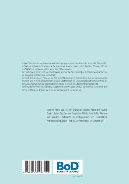 In diesem Band sind drei populärwissenschaftliche Vorträge versammelt, die die Autorin in den Jahren 2008, 2010 und 2011 im Stadtmuseum Quakenbrück gehalten hat. Das Museum hatte sie vorher in zwei einzelnen Broschüren ("Seneca und Plinius" und "Weltall, Erde und Mensch bei Plinius dem Älteren") herausgegeben.Der erste Vortrag bietet eine Einführung in die Philosophie Senecas an Hand der Trostschrift, die der Philosoph aus der Verbannung auf Korsika an seine Mutter Helvia gerichtet hatte.Der zweite stellt den jüngeren Plinius und sein Werk vor. Im Mittelpunkt stehen die beiden Briefe, die er über den Ausbruch des Vesuvs im Jahre 79 n. Chr. geschrieben hatte. Bei dieser Katastrophe kam sein Onkel und Adoptivvater Plinius der Ältere ums Leben, weil er sich vor allem aus wissenschaftlichem Interesse zu nahe an den Gefahrenherd herangewagt hatte.Von ihm und seinem Werk "Naturalis Historia", das als größtes seiner Art aus der Antike auf uns gekommen ist, handelt der dritte Vortrag. ImMittelpunkt steht das, was Plinius dort über Kosmos, Erde und Mensch sagt.