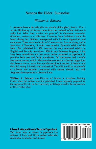L. Annaeus Seneca, the elder (his son was the philosopher) lived C. 55BC-AD 40. His history of his own times from the outbreak of the civul war is sadly lost. What does survive are parts of his Oratorum sententiae, divisiones, colores - a collection of extracts from declaimers whom he heard during his own lifetime, interspersed with his own digressions and comments. There were ten books of Controversiae, five surviving, and at least two Suasoriae, of which one remains. This edition, first published in 1928, remains the only annotated edition in English and the only one (since 1909) in any European language. It has long been unavailable and never appeared before in paperback. It provides both text and facing translation, full annotation and a useful introductory essay, which offers trenchant correction of earlier suggestions that Seneca was no more than a professional hack teacher of rhetoric, and that his Latinity is inferior and unclassical. This edition will be most useful to scholars and students concerned with ancient rhetoric and with Augustan developments in classical Latin.