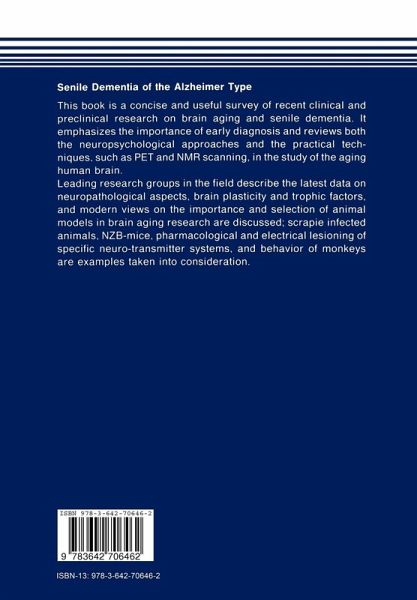 Early Diagnosis of Senile Dementia of the Alzheimer Type.- I. Behavioral and Clinical Aspects.- Cognitive Function in Normal Aging and Early Dementia.- Senile Dementia of the Alzheimer Type: Diagnostic and Differential Diagnostic Features with Special Reference to Functional Assessment Staging.- Assessment of Cognition and Affective Symptoms in Dementia.- The AGP System: Assessment of Symptoms in Psychogeriatric Patients.- Cognitive Deficits in Parkinson's Disease.- Differential Diagnosis: Depression Versus Dementia.- Early Diagnosis of Dementia: Possible Contributions of Neuropsychology.- II. Brain Tissue Parameters.- EEG and Evoked Potentials in the Diagnosis of Dementias.- Nuclear Magnetic Resonance and Early Diagnosis of Brain Pathology.- Positron Tomography and the Differential Diagnosis and Pathophysiology of Alzheimer's Disease.- Investigation of Regional Cerebral Blood Flow and Metabolism in Dementia.- Novel Developments in the Neuropathology of Senile Dementia of the Alzheimer Type.- Are Neurons of the Human Cerebral Cortex Really Lost During Aging? A Morphometric Examination.- Senile Dementia of the Alzheimer Type: Morphological and Immunocytochemical Studies.- Neurotransmitter Receptor Alterations in Alzheimer's Disease.- Co-Localization of Aluminium and Silicon in Senile Plaques: Implications for the Neurochemical Pathology of Alzheimer's Disease.- Biochemical Changes in Alzheimer's Disease: A Comment.- The Nature of Neurofibrillary Tangles.- Brain Plasticity and Trophic Factors.- Trophic Factors in Brain Aging and Disease.- Melanocortin Peptides and Neural Plasticity.- Brain Plasticity and Aging.- Animal Models.- Parallels and Contrasts Between Scrapie and Dementia of the Alzheimer Type and Ageing: Strategies and Problems for Experiments InvolvingLife Span Studies.- Animal Models of Geriatric Cognitive Dysfunction: Evidence for an Important Cholinergie Involvement.- Animal Models of Jacksonian Dissolution of Memory in the Aged.- Mechanisms Underlying Pharmacologic Modifications of the Hippocampal Lesion Syndrome.- Lesions of the Nucleus Basalis in the Rat: Functional Changes.- AF64A Cholinotoxicity: Functional Aspects.- Novel Approaches in the Study of Brain Acetylcholine Function: Neuropharmacology, Neuroanatomy, and Behavior.- Immunologic Factors Related to Cognitive/Behavioral Dysfunctions in Aging.- Morphological Studies on Brain Structures of the NZB Mouse: An Animal Model for the Aging Human Brain?.