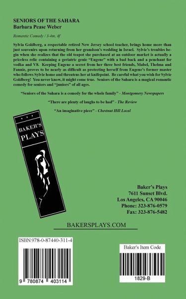 Romantic Comedy 3-4m, 4f Sylvia Goldberg, a respectable retired New Jersey school teacher, brings home more than just souvenirs upon returning from her grandson's wedding in Israel. Sylvie's troubles begin when she realizes that the old teapot she purchased at an outdoor market is actually a priceless relic containing a geriatric genie "Eugene" with a bad back and a penchant for vodka and V8. Keeping Eugene a secret from her three best friends, Mabel, Thelma and Fannie, proves to be nearly as