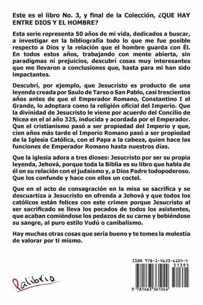 Este es el libro No. 3, y final de la Colección, ¿QUE HAY ENTRE DIOS Y EL HOMBRE? Esta serie representa 50 años de mi vida, dedicados a buscar, a investigar en la bibliografía todo lo que me fue posible respecto a Dios y la relación que el hombre guarda con Él. En todos estos años, trabajando con mente abierta, sin paradigmas ni prejuicios, descubrí cosas muy interesantes que me llevaron a conclusiones que, hasta para mi han sido impactantes. Descubrí, por ejemplo, que Jesucristo es producto de una leyenda creada por Saulo de Tarso o San Pablo, casi trescientos años antes de que el Emperador Romano, Constantino I el Grande, lo adoptara como la religión oficial del Imperio. Que la divinidad de Jesucristo le viene por acuerdo del Concilio de Nicea en el al año 325, inducida y acordada por el Emperador. Que el cristianismo pasó a ser propiedad del Imperio y que, cien años más tarde el Imperio Romano pasó a ser propiedad de la Iglesia Católica, con el Papa a la cabeza, quien hace las funciones de Emperador Romano hasta nuestros días. Que la iglesia adora a tres dioses: Jesucristo por ser su propia leyenda, Jehová, porque toda la Biblia es su libro que habla de él en su relación con el judaísmo y, a Dios Padre todopoderoso. Que los confunde y hace con ellos un coctel. Que en el acto de consagración en la misa se sacrifica y se descuartiza a Jesucristo en ofrenda a Jehová y que todos los católicos están felices con este crimen porque Jesucristo al ser sacrificado se lleva los pecados de todos los asistentes, que acaban comiéndose los pedazos de su carne y bebiéndose su sangre, al puro estilo Vudú o canibalismo. Hay muchas otras cosas que sería bueno y te tomes la molestia de valorar por ti mismo.
