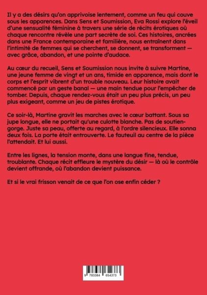 Il y a des désirs qu'on apprivoise lentement, comme un feu qui couve sous les apparences. Dans Sens et Soumission, Eva Rossi explore l'éveil d'une sensualité féminine à travers une série de récits érotiques où chaque rencontre révèle une part secrète de soi. Ces histoires, ancrées dans une France contemporaine et familière, nous entraînent dans l'intimité de femmes qui se cherchent, se donnent, se transforment - avec grâce, abandon, et une pointe d'audace.Au coeur du recueil, Sens et Soumission nous invite à suivre Martine, une jeune femme de vingt et un ans, timide en apparence, mais dont le corps et l'esprit vibrent d'un trouble nouveau. Leur histoire avait commencé par un geste banal - une main tendue pour l'empêcher de tomber. Depuis, chaque rendez-vous était un peu plus précis, un peu plus exigeant, comme un jeu de pistes érotique.Ce soir-là, Martine gravit les marches avec le coeur battant. Sous sa jupe longue, elle ne portait qu'une culotte blanche. Pas de soutien-gorge. Juste sa peau, offerte au regard, à l'ordre silencieux. Elle sonna deux fois. La porte était entrouverte. Le fauteuil au centre de la pièce l'attendait. Et lui aussi.Entre les lignes, la tension monte, dans une langue fine, tendue, troublante. Chaque récit effleure le mystère du désir - là où le contrôle devient offrande, où l'abandon devient puissance.Et si le vrai frisson venait de ce que l'on ose enfin céder ?