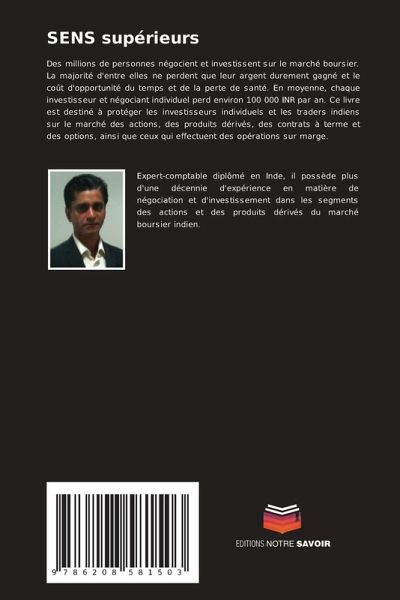 Des millions de personnes négocient et investissent sur le marché boursier. La majorité d'entre elles ne perdent que leur argent durement gagné et le coût d'opportunité du temps et de la perte de santé. En moyenne, chaque investisseur et négociant individuel perd environ 100 000 INR par an. Ce livre est destiné à protéger les investisseurs individuels et les traders indiens sur le marché des actions, des produits dérivés, des contrats à terme et des options, ainsi que ceux qui effectuent des opérations sur marge.