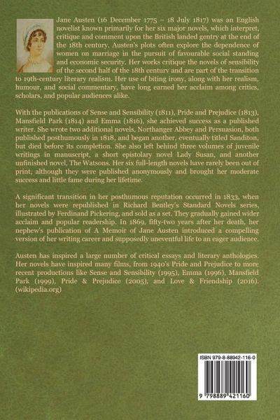 Sense and Sensibility is a novel by Jane Austen, published in 1811. It was published anonymously; By A Lady appears on the title page where the author's name might have been. It tells the story of the Dashwood sisters, Elinor (age 19) and Marianne (age 16¿) as they come of age. They have an older half-brother, John, and a younger sister, Margaret (age 13). The novel follows the three Dashwood sisters as they must move with their widowed mother from the estate on which they grew up, Norland Park. Because Norland is passed down to John, the product of Mr. Dashwood's first marriage, and his young son, the four Dashwood women need to look for a new home. They have the opportunity to rent a modest home, Barton Cottage, on the property of a distant relative, Sir John Middleton. There Elinor and Marianne experience love, romance, and heartbreak. The novel is set in South West England, London, and Sussex, probably between 1792 and 1797. The novel, which sold out its first print run of 750 copies in the middle of 1813, marked a success for its author. It had a second print run later that year. It was the first Austen title to be republished in England after her death, and the first illustrated Austen book produced in Britain, in Richard Bentley's Standard Novels series of 1833. The novel has been in continuous publication since 1811, and has many times been illustrated, excerpted, abridged, and adapted for stage, film, and television. About Jane Austen Jane Austen (16 December 1775 - 18 July 1817) was an English novelist known primarily for her six major novels, which interpret, critique and comment upon the British landed gentry at the end of the 18th century. Austen's plots often explore the dependence of women on marriage in the pursuit of favourable social standing and economic security. Her works critique the novels of sensibility of the second half of the 18th century and are part of the transition to 19th-century literary realism. Her use of biting irony, along with her realism, humour, and social commentary, have long earned her acclaim among critics, scholars, and popular audiences alike. With the publications of Sense and Sensibility (1811), Pride and Prejudice (1813), Mansfield Park (1814) and Emma (1816), she achieved success as a published writer. She wrote two additional novels, Northanger Abbey and Persuasion, both published posthumously in 1818, and began another, eventually titled Sanditon, but died before its completion. She also left behind three volumes of juvenile writings in manuscript, a short epistolary novel Lady Susan, and another unfinished novel, The Watsons. Her six full-length novels have rarely been out of print, although they were published anonymously and brought her moderate success and little fame during her lifetime. A significant transition in her posthumous reputation occurred in 1833, when her novels were republished in Richard Bentley's Standard Novels series, illustrated by Ferdinand Pickering, and sold as a set. They gradually gained wider acclaim and popular readership. In 1869, fifty-two years after her death, her nephew's publication of A Memoir of Jane Austen introduced a compelling version of her writing career and supposedly uneventful life to an eager audience. Austen has inspired a large number of critical essays and literary anthologies. Her novels have inspired many films, from 1940's Pride and Prejudice to more recent productions like Sense and Sensibility (1995), Emma (1996), Mansfield Park (1999), Pride & Prejudice (2005), and Love & Friendship (2016). (wikipedia.org)