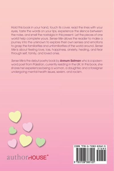Hold this book in your hand, touch its cover, read the lines with your eyes, taste the words on your lips, experience the silence between the noise, and smell the nostalgia in this present. Let the pieces of one world help complete yours. Sense Me allows the reader to make a journey into the unknown to explore their own senses and emotions to grasp the familiarities and unfamiliarities of the world around. Sense Me is about feeling love, loss, happiness, anxiety, healing, and fear through self, family, and loved ones. Sense Me is the debut poetry book by Annum Salman who is a spoken-word poet from Pakistan, currently residing in the UK. In this book, she shares her experiences being a woman, a daughter, and a foreigner undergoing mental-health issues, sexism, and racism.