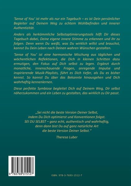 ¿Sense of Yoü ist mehr als nur ein Tagebuch - es ist Dein persönlicher Begleiter auf Deinem Weg zu echtem Wohlbefinden und innerer Authentizität. Anders als herkömmliche Selbstoptimierungstools hilft Dir dieses Tagebuch dabei, Deine eigene innere Stimme zu erkennen und ihr zu folgen. Denn wenn Du weißt, was Du wirklich willst und brauchst, kannst Du Dein Leben nach Deinen wahren Wünschen gestalten. ¿Sense of Yoü ist eine harmonische Mischung aus täglichen und wöchentlichen Reflektionen, die Dich in kleinen Schritten dazu ermutigen, den Fokus auf Dich selbst zu legen. Ergänzt durch monatliche, innenschauende Fragen, anregende Impulse und inspirierende Musik-Playlists, führt es Dich tiefer, als Du es bisher kennst. So kannst Du über das Bekannte hinausgehen und Dich wahrhaftig kennenlernen. Diese perfekte Symbiose begleitet Dich auf Deinem Weg, Dir selbst näherzukommen und ein Leben zu gestalten, das wirklich zu Dir passt.