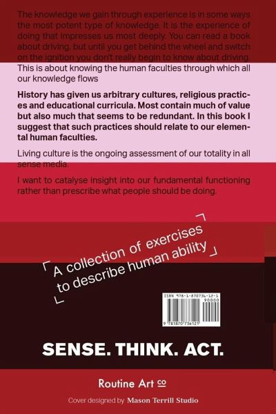 This practical core of this book is a collection of about 200 exercises to experience basic human ability. The senses pick up information in various media from outside and inside the body. They monitor what is happening. This sensory information then travels along nerve pathways to the brain where it is compared with past experience, analysed and evaluated. The result of this processing is a decision to do or not do. Doing something inevitably requires movement and muscle action; whether it be writing a poem, taking evasive action in the face of attack or chewing the top of your pencil. This sequence provides a model for the organisation of the book. The first half is a detailed description of each sense, each mental faulty and a set of basic muscle actions. The second part is a collection of about 200 exercises to allow the reader to experience our most elemental human abilities. The author has an idea of cultural renewal starting from basic human abilities. This book may find wide appeal as a retro-styled exercise book, illustrated with pages from the authors research notebooks. There is much to surprise and delight readers. The idea of collecting exercises to explore our basic abilities arose from previous research into basic human life supports published by Unicorn Bookshop in Brighton, and Schocken Books New York, as the trilogy 'Survival Scrapbooks: Shelter, Food and Energy'. Whilst researching 'Survival Scrapbook Energy' I came across a detailed description of standing in Iyengar's classic book 'Light on Yoga'. I then thought of Francis Bacon's 'Idols of the Mind' as similarly describing an elemental ability. I wondered if a collection could be made which covered all the basic human abilities. I was doing body work with the X6 Dance Group near Tower Bridge in London, who were rethinking the relation of dance to the human being. This fed me with many ideas and experiences, especially in the area of muscle action. The information was made into a Wikimedia website in 2005 with help from webmaster Gordon Joly. Since that time 'Sense-think-act' has become a prime paradigm of the Ai and robotics industry; and 'Brain Training' and physical exercise routines have become big business. I think my own version of Sense-Think-Act works better as an book than a wiki. Its radical arguments hark back to Whole Earth Catalogue and John Cage's ideas of 'starting from scratch' but there's a new generation of smartphone book readers that are hopefully rediscovering that kind of utopian and anti-corporate thinking.