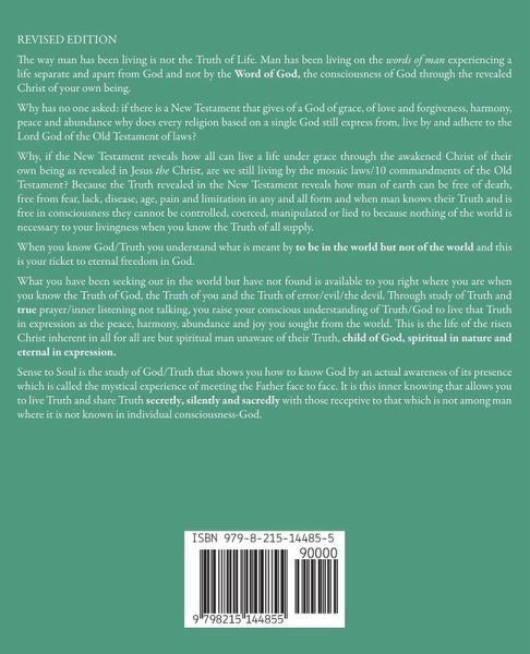 REVISED EDITION The way man has been living is not the Truth of Life. Man has been living on the words of man experiencing a life separate and apart from God and not by the Word of God, the consciousness of God through the revealed Christ of your own being. Why has no one asked: if there is a New Testament that gives of a God of grace, of love and forgiveness, harmony, peace and abundance why does every religion based on a single God still express from, live by and adhere to the Lord God of the Old Testament of laws? Why, if the New Testament reveals how all can live a life under grace through the awakened Christ of their own being as revealed in Jesus the Christ, are we still living by the mosaic laws/10 commandments of the Old Testament? Because the Truth revealed in the New Testament reveals how man of earth can be free of death, free from fear, lack, disease, age, pain and limitation in any and all form and when man knows their Truth and is free in consciousness they cannot be controlled, coerced, manipulated or lied to because nothing of the world is necessary to your livingness when you know the Truth of all supply. When you know God/Truth you understand what is meant by to be in the world but not of the world and this is your ticket to eternal freedom in God. What you have been seeking out in the world but have not found is available to you right where you are when you know the Truth of God, the Truth of you and the Truth of error/evil/the devil. Through study of Truth and true prayer/inner listening not talking, you raise your conscious understanding of Truth/God to live that Truth in expression as the peace, harmony, abundance and joy you sought from the world. This is the life of the risen Christ inherent in all for all are but spiritual man unaware of their Truth, child of God, spiritual in nature and eternal in expression. Sense to Soul is the study of God/Truth that shows you how to know God by an actual awareness of its presence which is called the mystical experience of meeting the Father face to face. It is this inner knowing that allows you to live Truth and share Truth secretly, silently and sacredly with those receptive to that which is not among man where it is not known in individual consciousness-God.