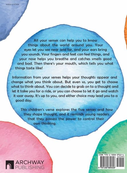 All your senses can help you to know things about the world around you. Your eyes let you see near and far, and your ears bring you sounds. Your fingers and feet can feel things, and your nose helps you breathe and catches smells good and bad. Then there's your mouth, which tells you what things taste like! Information from your senses helps your thoughts appear and change what you think about. But even so, you get to choose what to think about. You can decide to grab on to a thought and let it take you for a ride, or you can choose to let it go and watch it soar away. It's up to you, and either choice may lead you to a good day. This children's verse explores the five senses and how they shape thought, and it reminds young readers that they possess the power to control their own thinking.