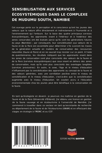 Cet ouvrage porte sur la perception et la conscience qu'ont les jeunes des valeurs que la nature offre directement et indirectement à l'humanité et à l'environnement qui l'entoure. Sur la base des quatre principaux services écosystémiques, les apprenants vivant à l'intérieur et à l'extérieur des zones conservées ont été évalués parce qu'ils sont les générations futures du pays (Namibie) ; par conséquent, leur sensibilisation aux valeurs de la faune et de la flore est essentielle pour déterminer s'ils suivront les traces de la génération actuelle en matière de conservation des ressources naturelles (faune et flore) et on ne saurait trop insister sur ce point. À l'aide de questionnaires, les résultats indiquent que les apprenants vivant dans les zones de conservation sont plus conscients des valeurs de la faune et de la flore (services écosystémiques) que ceux vivant en dehors des zones de conservation, mais qu'ils sont plus conscients des avantages tangibles (services provisoires). En outre, le sexe, l'âge et le niveau d'éducation n'influencent pas la sensibilisation des apprenants au concept de la faune et des valeurs générées, avec une corrélation positive entre le niveau de sensibilisation et le niveau d'éducation, c'est-à-dire que la sensibilisation augmente avec le niveau d'éducation. Un soutien accru à l'éducation environnementale chez les jeunes peut être bénéfique à la conservation de la faune.