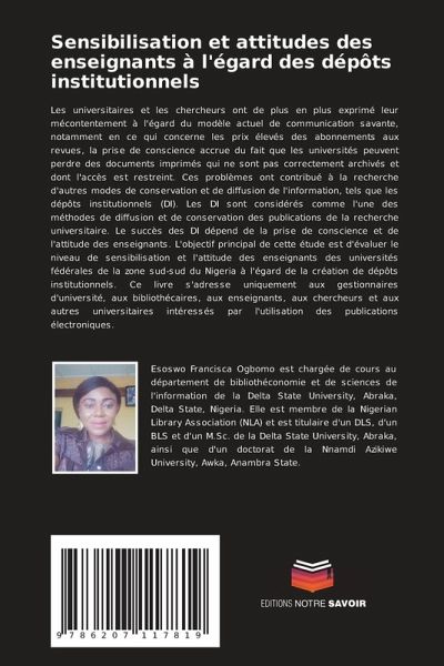 Les universitaires et les chercheurs ont de plus en plus exprimé leur mécontentement à l'égard du modèle actuel de communication savante, notamment en ce qui concerne les prix élevés des abonnements aux revues, la prise de conscience accrue du fait que les universités peuvent perdre des documents imprimés qui ne sont pas correctement archivés et dont l'accès est restreint. Ces problèmes ont contribué à la recherche d'autres modes de conservation et de diffusion de l'information, tels que les dépôts institutionnels (DI). Les DI sont considérés comme l'une des méthodes de diffusion et de conservation des publications de la recherche universitaire. Le succès des DI dépend de la prise de conscience et de l'attitude des enseignants. L'objectif principal de cette étude est d'évaluer le niveau de sensibilisation et l'attitude des enseignants des universités fédérales de la zone sud-sud du Nigeria à l'égard de la création de dépôts institutionnels. Ce livre s'adresse uniquement aux gestionnaires d'université, aux bibliothécaires, aux enseignants, aux chercheurs et aux autres universitaires intéressés par l'utilisation des publications électroniques.